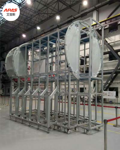 | 3:圖三展示的是模擬太空艙設(shè)備平臺(tái),整體高度7m,承載力4t,上面用于安裝太空艙模擬設(shè)備以及數(shù)據(jù)收集裝備,對(duì)于工業(yè)鋁型材扶梯平臺(tái)的整體承載力和物理性能有較高的要求。 |