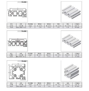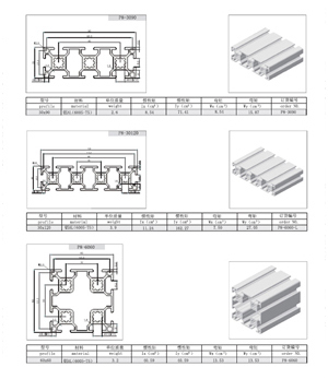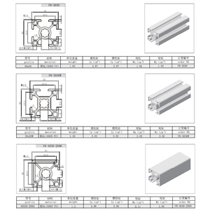 3030系列: 8mm槽寬的工業(yè)鋁型材系列適用于應(yīng)力強度較高的框架組合結(jié)構(gòu),它的外型采用圓角過度,表面經(jīng)過陽極氧化處理,堅固而又可靠,是工業(yè)框架應(yīng)用最為廣泛的型材之一,這一系列現(xiàn)有品種如下:30系列 P8-3030 P8-3030W P8-3030-2N90 P8-3030-2N180 P8-3030R P8-3060 P8-3090 P8-30120 P8-6060 |